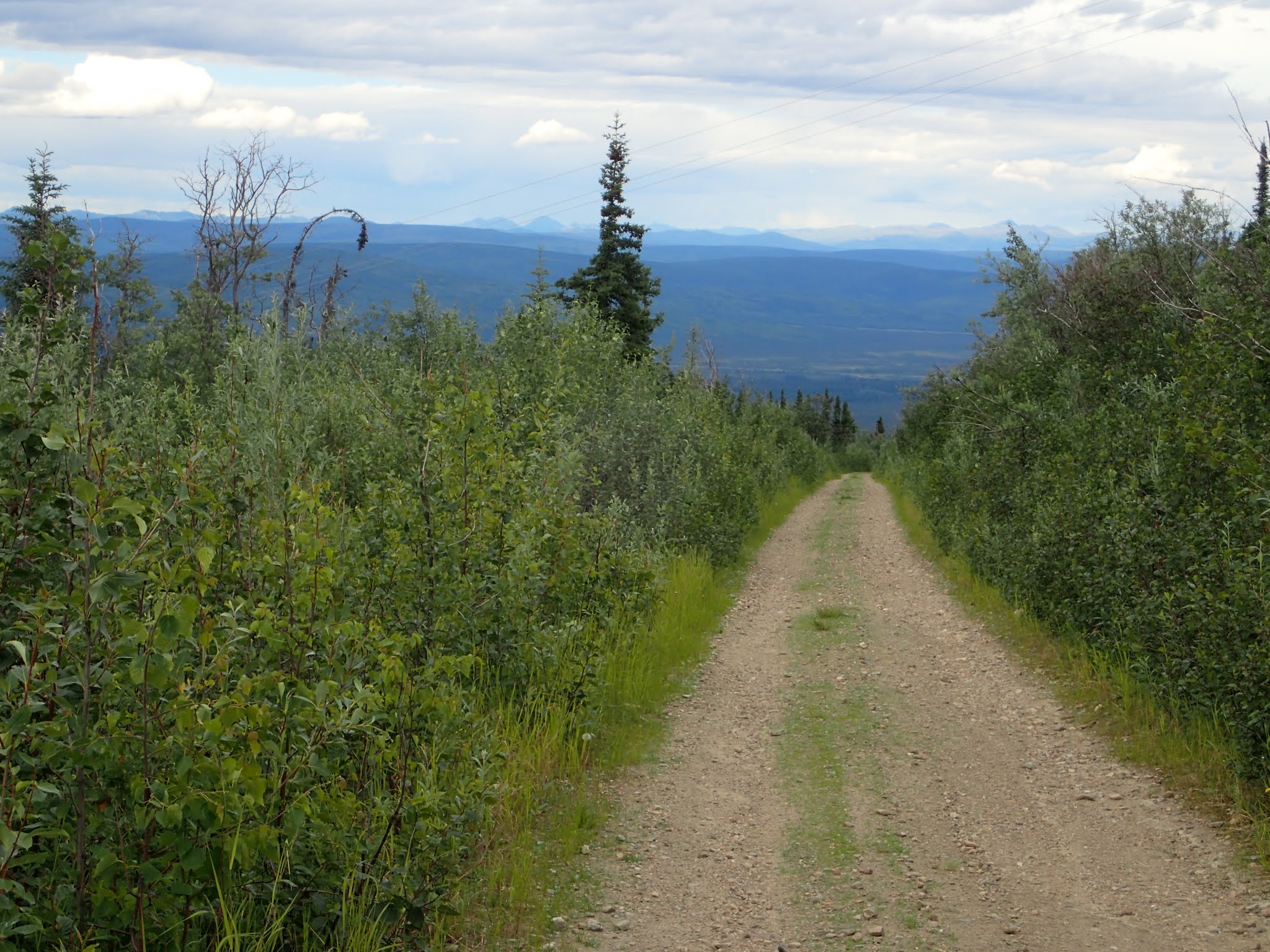 But Patrik waited for me, and we continued to Standard Creek and Cache Creek roads.  These are fun forestry roads with little traffic and in good shape. The two road systems are connected by a half-mile of swampy trail that we had to walk through. We got wet feet and were plagued by millions of mosquitoes. I stopped to reapply bug dope, but that didn’t seem to dissuade them much. Even for Fairbanks, they seemed worse than usual. Poor Patrik didn’t bring any bug dope and he was too far ahead to want to stop and wait for me. Nothing to do but keep moving and keep swatting.
