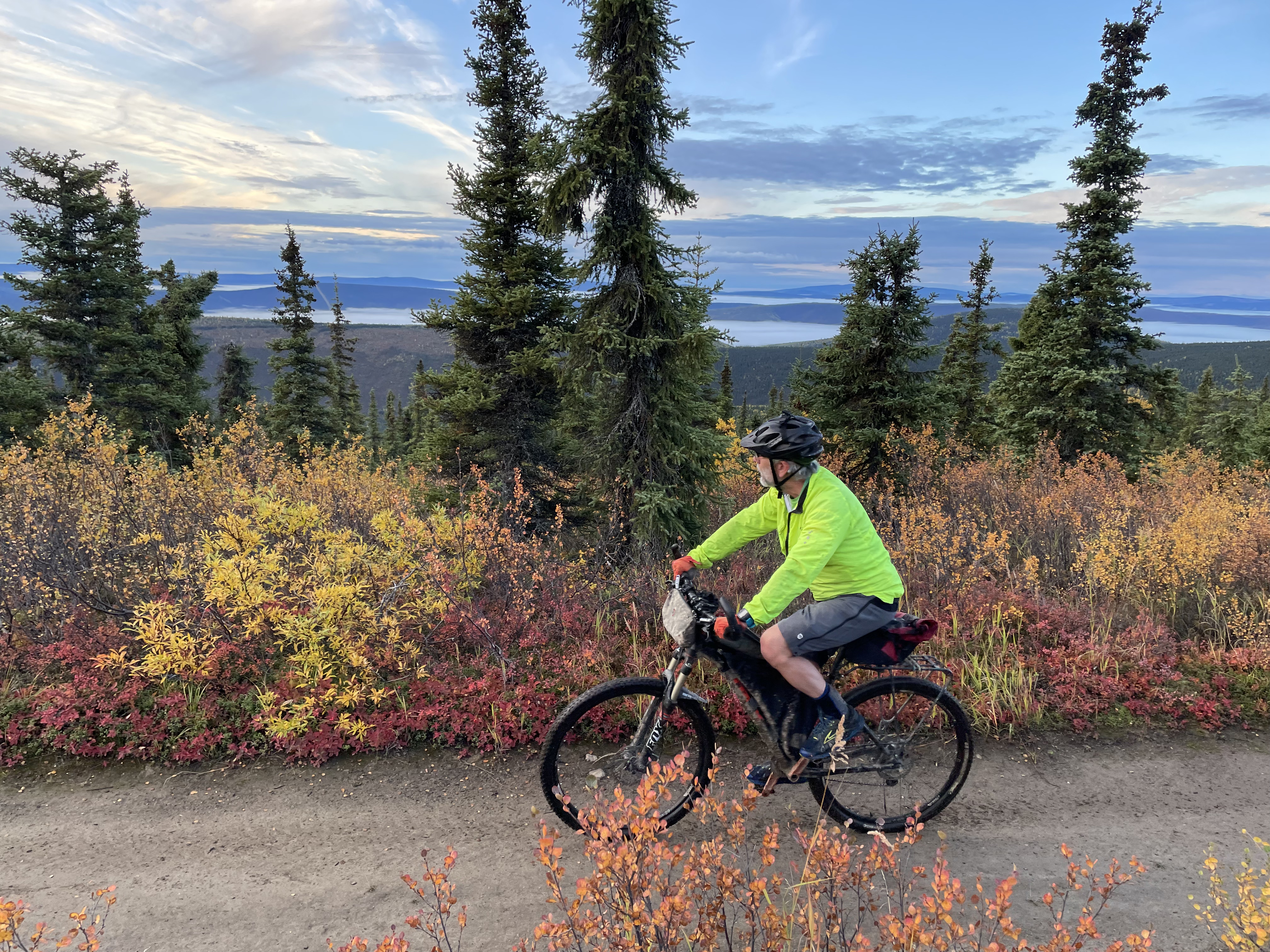 We were tired and dirty but satisfied. We had biked 68 miles, hiked 10 miles, and climbed over 12,000 feet. We had driven 400 miles to reach all the trailheads. Our actual time on the trails was 18.5 hours. And we had great weather! We got sprinkled on the first afternoon and had a brief shower on day two, but mostly it was warm (45-65F) and partly sunny. The fall colors were prime in the higher country. It was a great way to spend a couple of days in the Interior.
