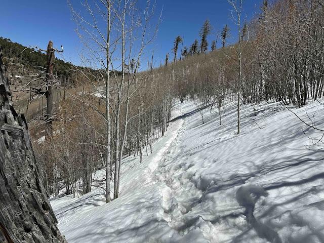 Up higher, I lost the trail in a ravine, where the trail paralleled a babbling creek. I think the trail crossed to the other bank of the creek, but that side was still covered in snow. It looked like maybe people had scrambled up the steep, snow-free side. It looked kind of sketchy, but I pushed forward and up. I soon doubted if that was the best decision, but summitting Chiricahua and finishing the loop beckoned, so I pressed on. Early on I looked down. Damn, that slope was steep! With rocks at the bottom. I picked my steps carefully.